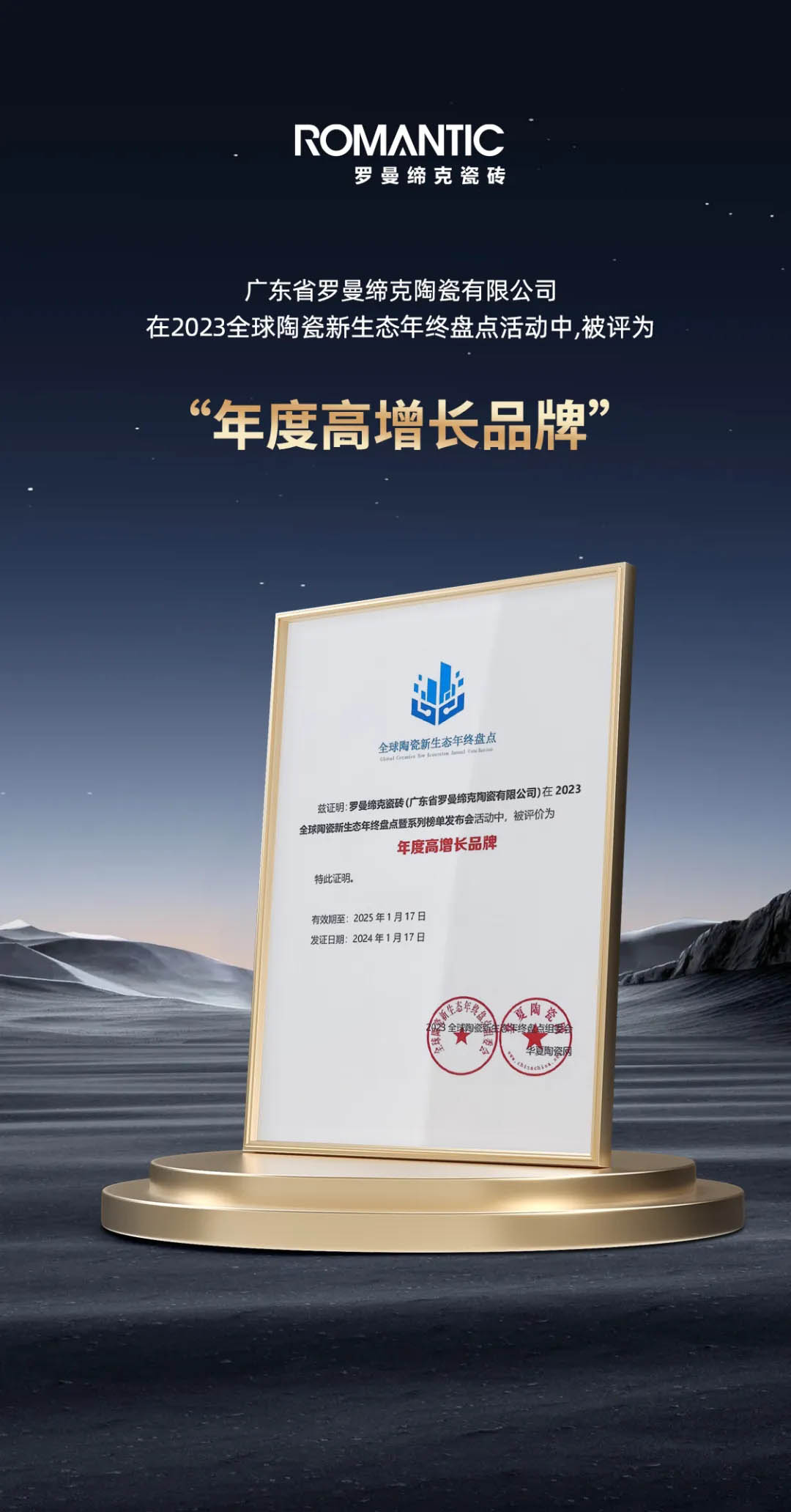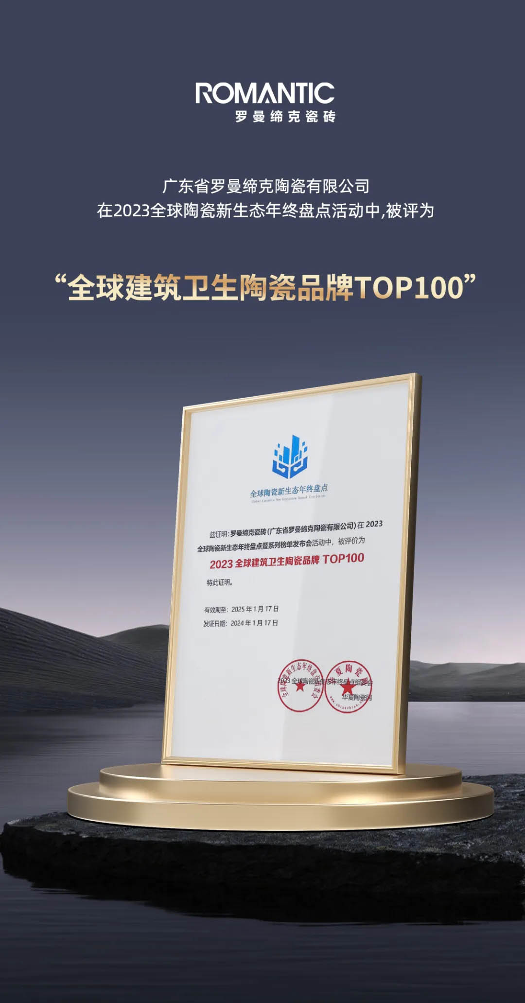 1月17日,增長的秘密——2023全球陶瓷新生態年終盤點暨設計驅動產品供應鏈論壇在中國陶瓷總部劇場隆重召開?,F場舉行系列榜單發布暨頒獎禮,羅曼締克瓷磚憑借卓越的品牌實力、創新的產品與技術,榮獲“2023全球建筑衛生陶瓷品牌TOP100”及“2023年度高增長品牌”雙項榮譽。