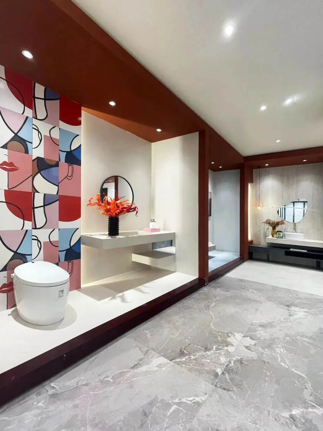 以寫意的方式提取皖韻的意境,整體以弧形動線為結構,地面采用木紋進行演繹,宛如水墨般肆意流淌。局部以錯落有致的邊形點綴,體現空間藝術與美學的結合。