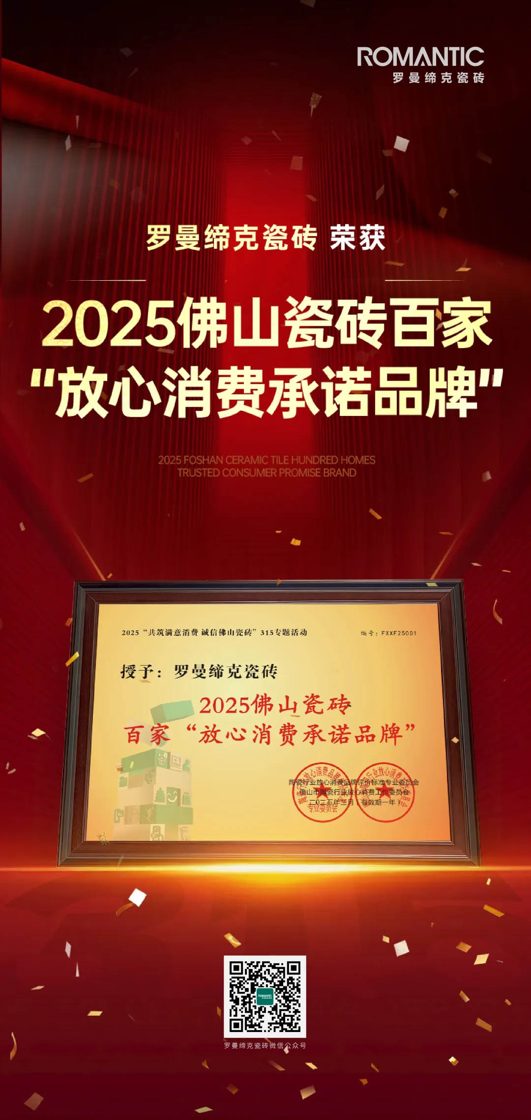 一份榮譽,一份鞭策。這份榮譽屬于每一位支持羅曼締克瓷磚的消費者與合作伙伴,我們將以此為新起點,繼續(xù)強化創(chuàng)新驅動之力,點燃發(fā)展新質生產力的強力引擎,用實際行動守護消費者權益,讓民族陶瓷品牌成為品質生活的保障。