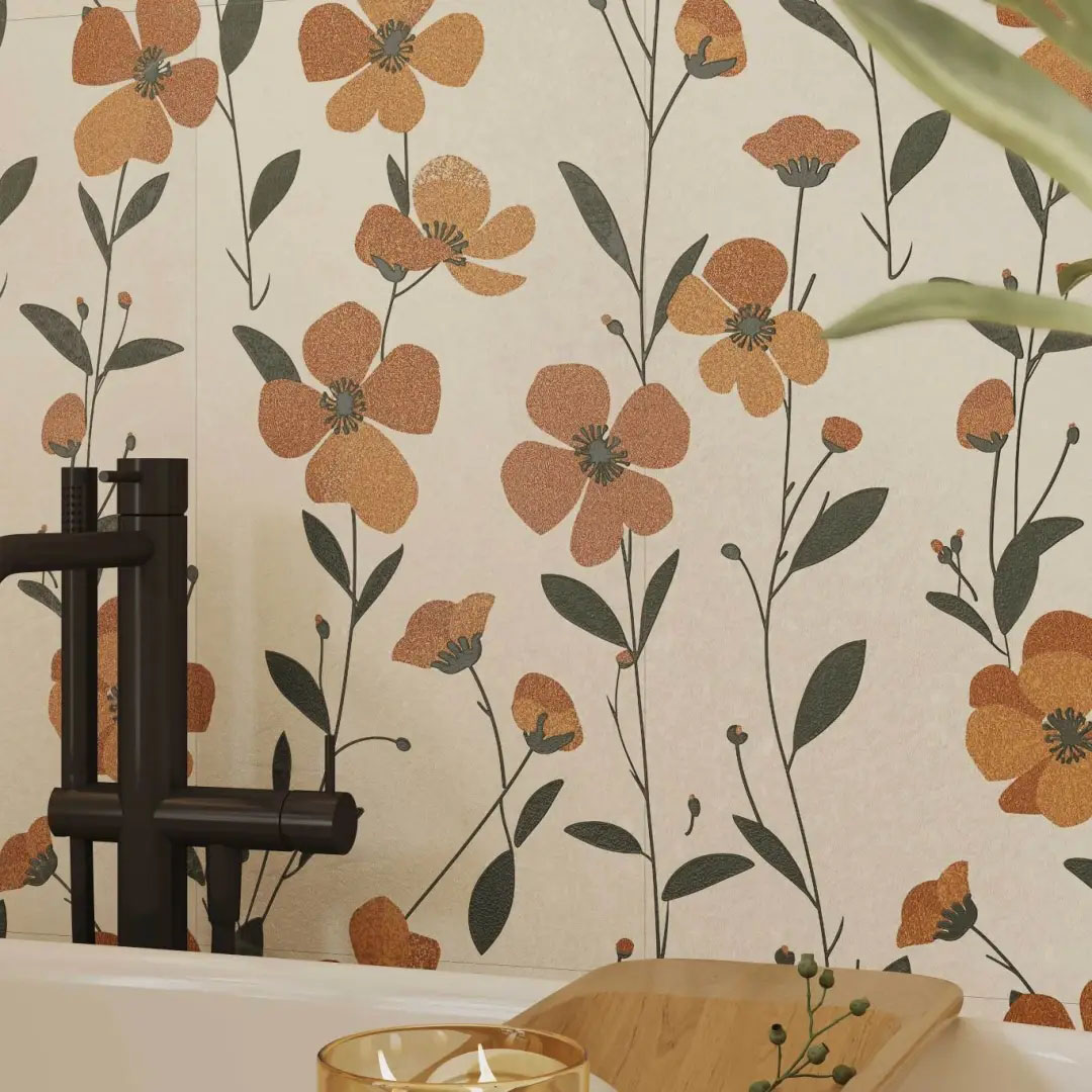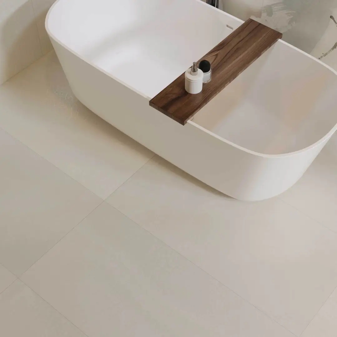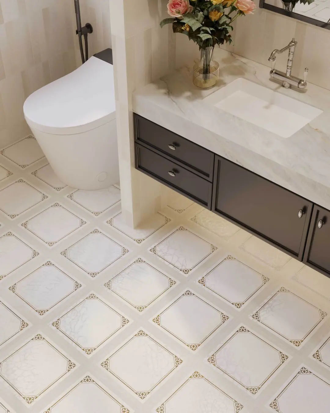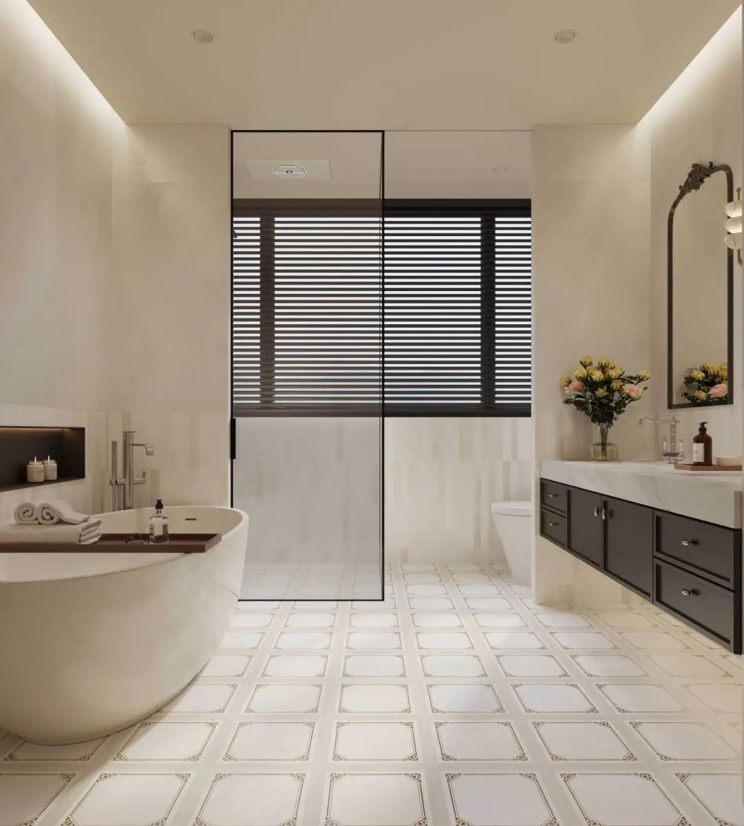 米白色肌底上,菱格紋以嚴(yán)謹(jǐn)?shù)闹刃蚋兄貥?gòu)了冰裂紋的隨機(jī)美學(xué),四周環(huán)繞的精美花紋邊框,恰似古典畫(huà)框的現(xiàn)代演繹。應(yīng)用于衛(wèi)浴間地面之上,菱格的理性秩序與邊框的細(xì)膩雕琢,在碰撞中重構(gòu)東方意境,賦予傳統(tǒng)以摩登張力。